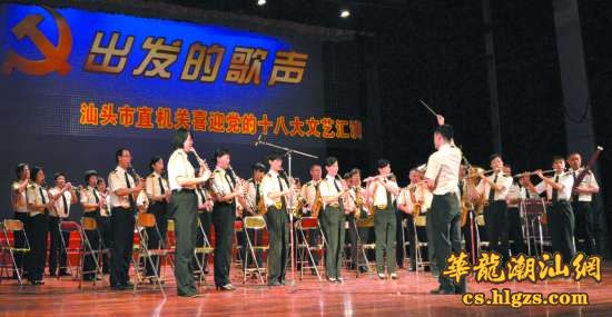 演出在管乐演奏《勇往直前进行曲》雄壮豪迈的旋律中拉开帷幕。紧接着,优美抒情的女声独唱《出发的歌声》、古色古香的书法古琴意境表演《古韵妙笔谱新章》、妙曼深情的群舞《祖国不会忘记》等节目相继登台,小品、萨克斯演奏、诗歌朗诵、潮剧演唱、合唱等节目演出博得了台下观众一阵阵热烈的掌声。