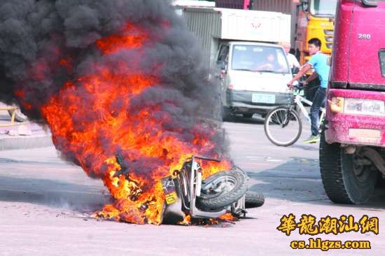 本报讯(记者 曾春乐 摄影报道) 昨天下午3时许,市区长江路与天山路交界处发生一起砂石车与摩托车碰撞事故,摩托车遭砂石车推前10多米后燃烧起火,事故中幸无人员受伤。