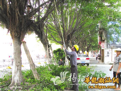 为保持市区主要道路绿化树木的美观,达到通风、透光的目的,提高树木的抗风能力,避免树木挡住路灯的光线,消除枯萎树枝对行人行车安全造成的隐患,近日,有关部门组织人员对部分绿化树进行修剪。图为园林工人对市区榕华大道两旁的绿化树木进行修剪场面。郭楚凯 摄