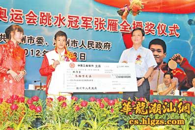 本报讯(记者 庞磊成) 鲜花送给奥运冠军,掌声为潮州健儿喝彩。昨天下午,市委、市政府在市党政机关会堂隆重举行仪式,向载誉归来的伦敦奥运会跳水冠军张雁全授奖。