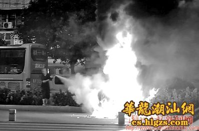 附近铺面的余先生告诉记者,发生事故时正是交通高峰时段,他在店内突然发现红绿灯路口浓烟滚滚火光冲天,便马上出来观看,并用相机录下火灾现场。从他拍摄的画面看,当时路口的行人已散开,有附近热心群众拿出灭火器在灭火(如图),但由于火势太猛,未能将火扑灭。6时20分左右,消防队员赶到将火扑灭。据了解,事故并未造成人员伤亡。