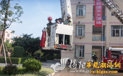 近日,驻地消防官兵在揭东县华南师大粤东实验学校进行一场火灾扑救和逃生演练。演练现场,新式灭火器、高压水枪对准熊熊燃烧的火焰不停扫射,浓厚的粉尘和巨大的水雾一下子就将“肆虐”的火焰扑灭。与此同时,高架云梯的铁臂直升5楼,将“被困”的三名师生安全解救(见上图。苏瀛洲 摄)。