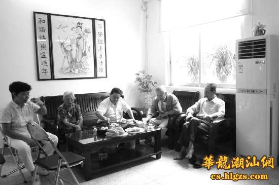 来到二楼大客厅,进门迎面墙上挂着一副写着“温馨家园”的书法作品。客厅摆放着木质沙发、茶几、电视、音响,还有柜式空调机,窗明几净,温度适宜,一群老人正坐着喝工夫茶、看潮剧,一片其乐融融景象。