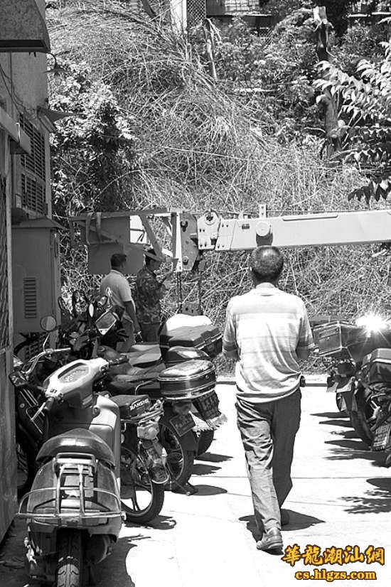 接到居民反映后,金平区城管局采取措施,组织人员对该片三角梅进行清除。由于植物高达6层楼,单靠人手无法进行修剪,工作人员唯有将吊车驶进小区内,利用机器辅助进行空中作业。前天中午,记者在现场看到,墙壁上的枯枝已被修剪得所剩无几,31栋居民楼一侧的区间道上堆放大量枯枝,高度约有四五米,行人难以通过。六七名城管工作人员顶着烈日分工协作,有的手持油锯继续修剪剩余枯枝,有的忙着将地上的枯枝清离现场。