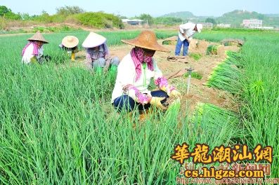 近年来,饶平县海山镇接连出现旱情,为抗旱夺丰收,该镇黄隆村的村民采用自动喷灌节水技术在旱地种植香葱等农作物,获得了较好的收成。图为日前该村村民在收获香葱。 本报记者 陈宏文 摄