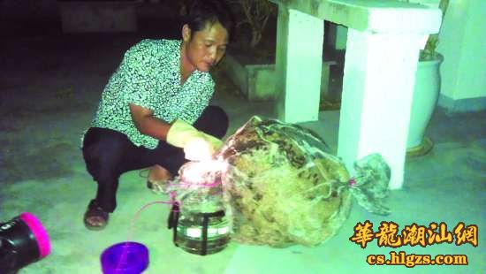 当天晚上8时许,从潮南雷岭山区赶来的捕蜂人阿文就开始行动了,洪先生及前来“观战”的朋友们则对这些凶猛的马蜂心存畏惧,躲得远远的。只见阿文观察了马蜂窝一番,然后点燃一根白色软线条,将其小心翼翼放进马蜂窝的进出口处,只见马蜂立即变得服服帖帖,他见状马上拿起一个网眼细密的软质铁网,迅速将蜂窝罩住提走。就这样,没一会儿功夫,让屋主烦恼不已的马蜂窝就被清理掉。