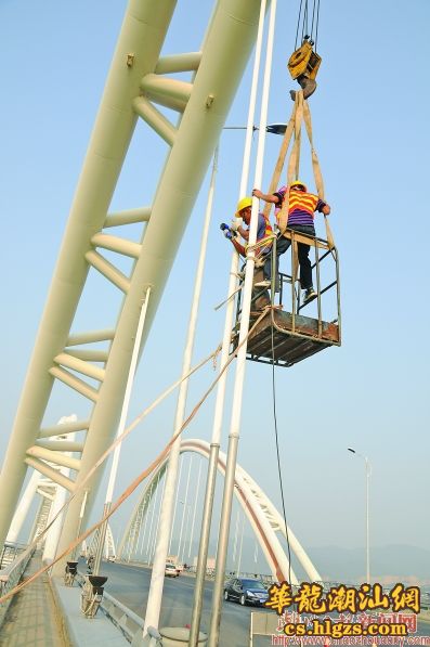 连日来,韩江大桥管理中心组织专业技术人员对金山大桥两侧的吊杆PE套管进行维护检修,并更换桥面上所有伸缩缝的橡胶止水带,以确保大桥安全。图为昨天下午技术人员在修补大桥吊杆PE套管。 本报记者 陈宏文 摄