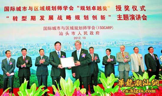 据了解,“规划卓越奖”是世界城市规划领域的最高奖项,相当于国际城市规划界的“诺贝尔奖”,全球历年来获得该奖的阿姆斯特丹、新加坡、迪拜等城市都是国际城市规划的典范。在今年第48届国际城市与区域规划师学会年会上,《汕头市城市发展战略规划》在全球各地提交的2000多个项目中脱颖而出,荣获学会最高奖“规划卓越奖”。学会评审团对《汕头市城市发展战略规划》的获奖评语:“这项规划既放眼于全球化的大背景,同时又深深根植于当地的实际,是一个能够积极应对各种变化与挑战,从而为当地提供了一条可持续发展道路的规划,是一个具有适应性、灵活性和充满潜力的规划。” 颁奖仪式上,许瑞生代表省政府对我市战略规划获奖表示祝贺,对专程莅汕颁奖的伊斯梅尔主席和马丁副主席表示感谢。他指出,省委、省政府将把促进区域协调发展作为全省转型升级的主攻方向,支持粤东西北地级市城区扩容提质、聚集发展、率先崛起。汕头是粤东的区域中心城市,担负推进“汕潮揭”同城化和带动区域发展的重任。希望汕头市委、市政府以本次战略规划的编制和获奖为新的起点,充分发挥经济特区先行先试的优势,坚定走改革开发的发展道路,不断探索城市发展的新方法、新途径,建设粤东中心城市和创新型特区城市。