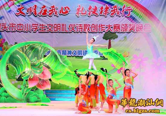 汕头市委、市政府历来高度重视创建文明城市工作,群众性精神文明创建活动蓬勃开展,去年,我市荣获“广东省文明城市”的称号,更让文明走进城的各个角落。为展示未成年人道德建设成果,推动文明汕头建设,市文明委在全市开展了中小学生文明礼仪诗歌创作大赛。本次大赛影响广泛,共收到全市中小学生投稿1000多篇,最终评选出一等奖作品2篇、二等奖5篇及一批优秀作品。晚会上,还为汕头市“奥飞杯”青少年公益宣传动漫创作大赛的获奖者颁奖。