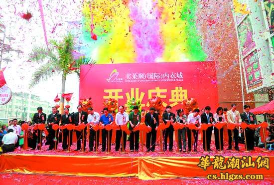今天上午,粤东地区规模最大的内衣家居服专业市场美莱顺(国际)内衣城在峡山街道开业,这是潮南区继成功举办2012中国潮南内衣家居服装节、荣膺“中国内衣家居服装名城”称号后推动纺织服装产业转型升级的又一重大举措。中国纺织品商业协会常务副会长彭桂福、中国针织工业协会副会长沈顺年、全国妇联发展部副主任杜力、广东省纺织协会秘书长陈茜薇、泰国华人青年商会会长李桂雄、上海潮汕商会会长姚文琛等出席开业庆典。从今天起至11月9日,美莱顺(国际)内衣城举办“一站式内衣家居服采购活动周”,邀请数千名国内外采购商参加,期间将举办内衣家居服专场发布秀、论坛、沙龙等多场活动。 本报记者 王开颖 陈史 摄影报道