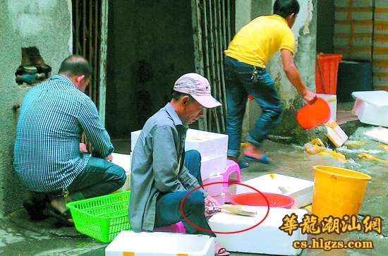 在档口旁边的地上,零零散散摆放着几个装着冰鲜鱼的泡沫塑料箱,两名伙计坐在小凳子上拿着手中的针管,正往一条条黄花鱼尾部注水(见图)。记者看到,旁边2个泡沫塑料箱分别装着未注水和已注过水的鱼,他们在给一条鱼注射进满满的一针管水后,便将针管浸入塑料盆的水中,抽满一针管水接着给下一条鱼注水,整个过程显得十分娴熟。
