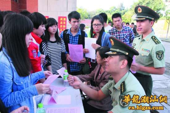 在汕头职业技术学院,记者看到,来自机电系、经济管理系、艺术体育系等5个系的300多名学生参加了报名应征活动。学校学生处的蓝科长告诉记者,学生的参军热情很高,已经有不少学生表达了参军的志向,还有许多学生已经在网上报了名。濠江区人武部政工科科长贺连璞告诉记者,该校已经有40名适龄男青年报名参军了。
