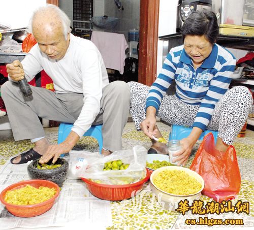 “橄榄糁”是一种风味独特的潮汕小菜,以其咸中带香的清爽口感和开胃消食的功效深受潮汕人喜爱。立冬时节腌制“橄榄糁”是以前流传下来的一种习俗,据说在这个季节尤其是立冬这一天腌制的“橄榄糁”容易保存,不易变质,且功效更佳。图为市区一户人家的阿伯阿婆正在自制“橄榄糁”。 杨文丰 郑楚藩 摄影报道