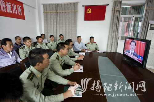 边防前詹派出所官兵和辖区村委干部、学校教师等党员群众怀着欢欣鼓舞的心情,认真收看收听党的十八大开幕电视实况直播。