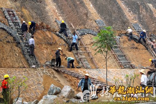 揭西县对外交通要道之一的五灰公路大修工程基本完成,配套工程正加紧推进。图为建设工人对公路两侧山体进行护坡施工。林生惠 李维照 摄