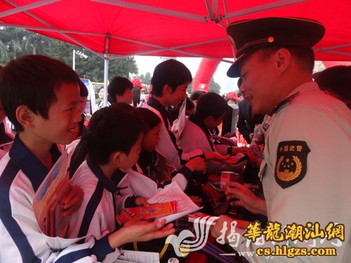 图为活动月启动仪式上,消防官兵向中小学生发放消防知识资料。通讯员 摄