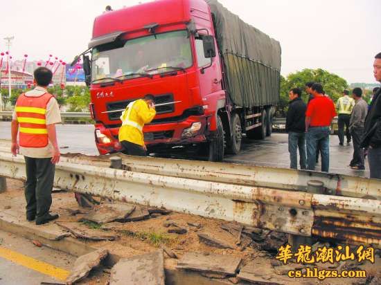 本报讯 (记者 刘婉萍 摄影报道)昨天上午11时左右,海湾大桥往市区下桥处发生一宗交通事故。一安徽籍重型仓栅式大货车疑因前轮爆胎失控,撞上大桥中心护栏导致车身打横卡住路道,从而引发了深汕高速深圳往汕头方向部分路段大塞车。所幸的是,事故中没有人员伤亡。