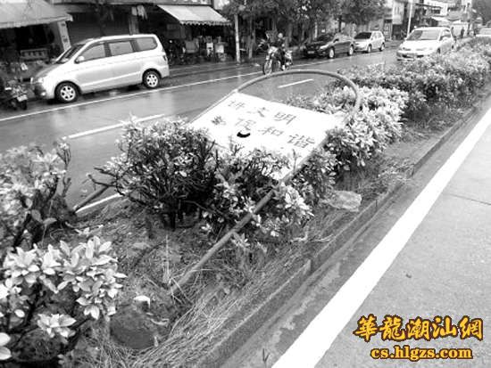 昨天中午12时多,记者来到嵩山路105号附近,果然看到有一座倒下的宣传牌重压在绿化带上,上面写有“讲文明,促和谐”的字样。(见右图)据附近一些铺面经营者称,这座宣传牌倒下已有一段时间了,却一直不见有人前来将其重新竖起来,呼吁有关方面能尽快进行修复。