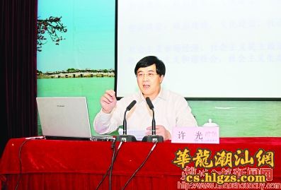 报告中,许光与韩山师范学院的师生们分享了自己学习贯彻党的十八大精神的体会和心得。他指出,学习贯彻好十八大精神,必须深入把握“六个新”,即:深入把握报告提出的大会主题的新内涵,深入把握报告对科学发展观历史地位的新评价,深入把握报告关于发展中国特色社会主义的新阐述,深入把握中国特色社会主义事业“五位一体”的新布局,深入把握全面建成小康社会和深化改革开放的新目标,深入把握报告关于提高党建科学化水平的新认识。