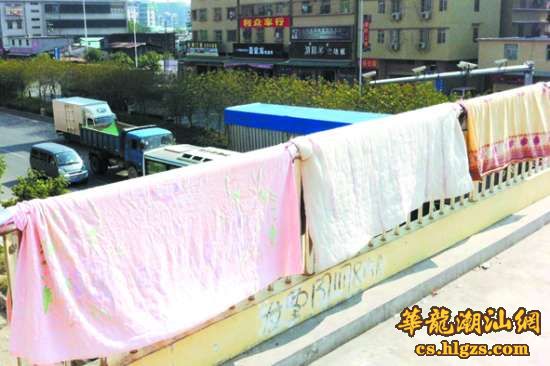 本报讯(记者 杨立轩 摄影报道)告别一周阴雨天气,D城昨天多云转晴,不少市民趁机将自家被单拿出来“透透气”。在市区金凤路人行天桥、金环北路旁堤围等地,一时间成了附近城中村居民晒被单的最佳场所。对此,有市民担心,在道路旁或天桥上晒被单,大煞风景之余存在安全隐患(见右图)。