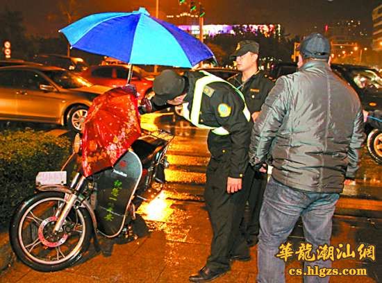 随后,巡查队员来到华山北路,一辆正准备搭客的非法营运二轮摩托车被执法队员逮个正着。驾驶该摩托车的男子却拒不配合,甚至钻到执法车底下不肯出来,经执法人员的轮番劝说和教育,躲在车底近20分钟的男子才接受了处罚。晚上9点,执法队员又在金环-金砂路口处,将一辆正在等红灯的非法营运摩托车拦截下,这辆摩托车除了进行非法营运外,还违规在车上加装了雨伞(见图)。