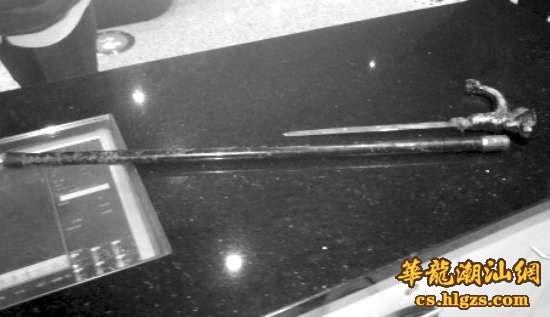 本报讯 (记者 黄泽春 摄影报道)20日,一名准备从潮汕机场乘坐飞机前往重庆的老年男性旅客接受安检时,其随身携带使用的拐杖内竟被查出含有一把刀(见右图)!这情况被潮汕机场安检人员发现后,老年乘客决定自弃拐杖,从而避免了这把“藏”刀的拐杖被带入飞机客舱。