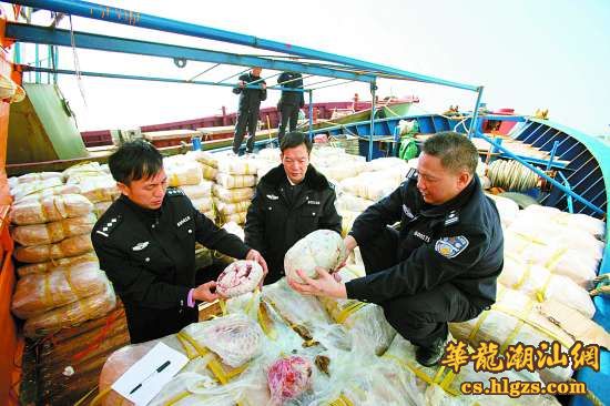 近日,汕头海关在惠来县附近海域查获1宗海上走私冻穿山甲案件,现场查扣无船号木质渔船一艘,缴获涉嫌走私冻穿山甲2032只,重达9吨,穿山甲鳞片325公斤,抓获涉案船员6名,案值约人民币1100万元。据介绍,穿山甲是濒危物种,属国家二级保护动物。 本报记者 康洁 摄影报道