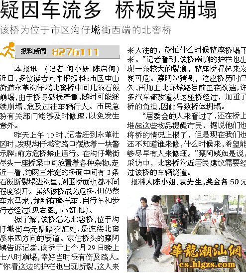 位于市区沟仔路西端、横跨北窖溪的一石桥,桥身破损严重,本报日前对此进行了报道(详见本版1月2日报道,见下截图)。近日,记者了解到,有关部门迅速行动,正在对该桥进行维修。