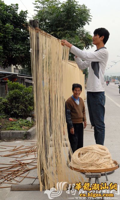 市洪阳镇街头,有面线手工制作者忙着将细细长长的面线垂挂在架子上晾晒。