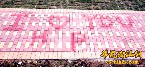 近日,记者来到市区临江北路榕江湿地公园的入口处,沿着彩砖小径一路慢行探寻,在渔政码头附近的小道上,“I 1 YOU HP”(下图。潘彬彬 摄)几个偌大的红色字眼煞是惹眼,而与该处相对应的围堤上也被胡乱喷上字样。记者观察发现,这些字样都是用红色油漆喷上,想要清除并不容易。