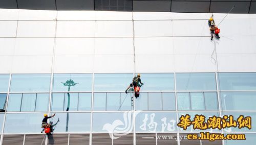 机场候机楼玻璃外墙做保洁。他们身体的一侧挂着水桶,系上安全带后,一手拿着清洁刷,悬于高空的玻璃幕墙外专心工作。
