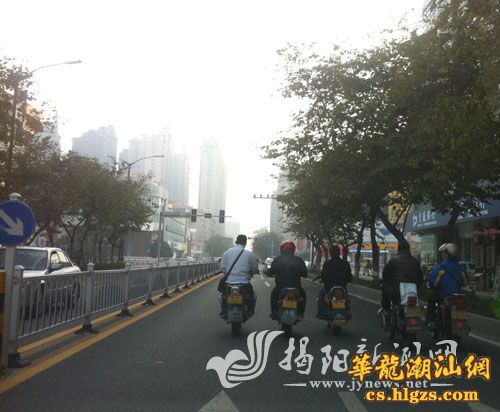 情景:近日,市区建阳路五辆摩托车并排行驶,将整个车道占据。后车不断提醒,前车众人仍然我行我素。