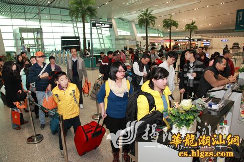 春运首日,揭阳潮汕机场众多旅客耐心排队办理登机手续,表情淡定。