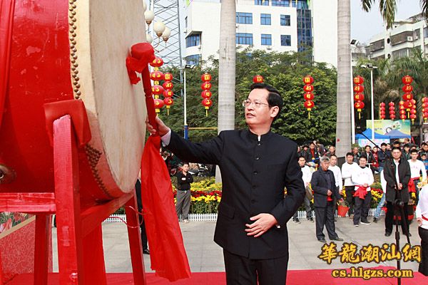 上午9时30分,开鼓迎春仪式开始,陈绿平致新春祝语:"风调雨顺新揭阳,开鼓迎春兆吉祥。我给父老乡亲拜年啦!祝大家幸福安康,万事如意!"接着,陈绿平擂响开春大鼓,现场锣鼓齐鸣,醒狮起舞,广场上群众体育健身活动、"亲子同乐"游园会、潮州音乐迎春演奏会、迎春灯谜大会猜等各项群众文化节目同时展开,全场欢腾。