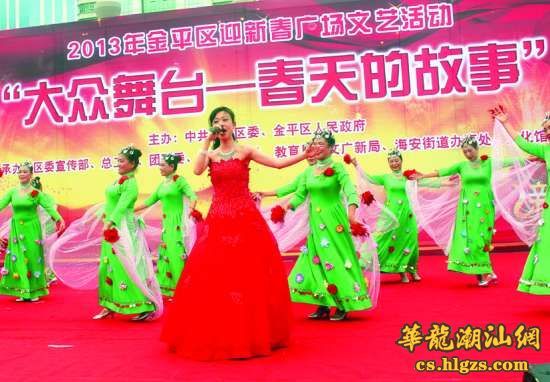 本报讯 (记者辛瑞玲 实习生李奕纯)昨天下午,市人民广场上载歌载舞,一场大型歌舞“春天的故事”在这里演绎和谐社会的幸福生活。金平区委、区政府在这里设立大众舞台,与民同乐,让人民群众在新春佳节度过美好时光。