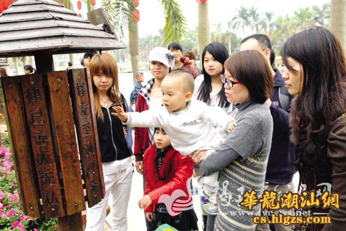 揭东万竹园里一名儿童在家长的指引下伸出小手拨动转轮。郑楚藩 摄