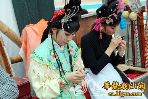 女演员在舞台后面,趁演出的空档,一位专注地玩着手机,一位认真地涂着指甲油。