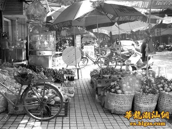 在市区东厦北路汕大附属二医院对面的人行步道,商铺占道经营的现象非常突出,记者走访看到,一家@条面店直接把“厨房”设在人行步道中间,同时搭起一个体积庞大的蓝色遮阳棚,底下摆放着四张桌子和十几张椅子,原本宽敞的人行步道被该食肆当成自家“地盘”,过路市民只能绕开走。在该路段的其他几家商铺,同样抢占门前的人行步道,肆意占道经营。龙眼北路和龙眼南路是占道经营的“重灾区”,在龙眼市场前,一家水果商贩将各种水果从店内一直摆放到人行步道上,留了一条仅容一人通过的“羊肠小道”。在金新路步行街路段,本身并不宽阔的人行道上摆满了卖果汁饮料、卖衣服、卖日用品的小摊……