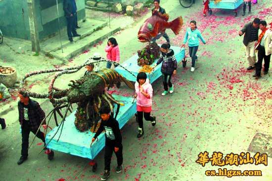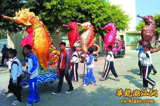 正月十七,记者一上岛就感受到浓浓的节日气氛,红色的炮屑随处可见,孩子们穿新衣,举花灯,奔跑嬉戏,大人们有说有笑,在自家门口挂上长长的鞭炮,准备迎接游灯队伍。在宫前村,记者看到,今年“新来”的几只海马花灯特别讨人喜欢,金黄色的大海马高2米,宽1米,另外4只小海马分别为大红色、橙色、褐色和桃红色。“这是海岛首次出现海马花灯,也是粤东第一个海马花灯。”宫前渔支部委员会书记游少川告诉记者,往年在各村的游灯队伍中,龙虾、宅鱿等海岛特色海货模型都很常见,唯独缺少最“高贵”的海马。此次海马花灯的出现让岛民们格外高兴,“相信新的一年里,会有更多的海马游到海岛来,渔民的收成会更好。”下午4时,记者在山顶村内赶上另一支游灯队伍,队伍中长两三米的鱿鱼、鳜鱼、龙虾花灯格外引人注目。岛民吴先生告诉记者,这些都是海岛特产中比较昂贵的,要是能捕获到它们,渔民们的收入就会成倍增加。