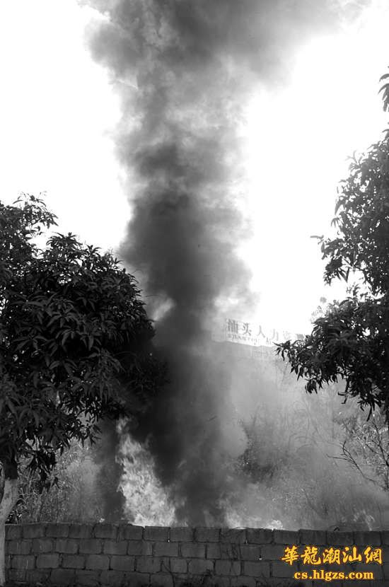 昨天上午9时37分,本报记者途经汕汾路与嵩山路交界处附近时发现,路边一处荒废场地的草丛正燃起熊熊大火,浓烟冲天,火势不断从着火处向四周的乱草堆蔓延,路边树木的树叶都已经着火,而火场背后就是几座住宅楼。本报记者第一时间拨打110报警并在现场等候。不一会儿,一辆警车就出现在眼前,两名龙津派出所民警急匆匆地上前观察火情并了解情况,这时,记者看了一下手表:9时40分。