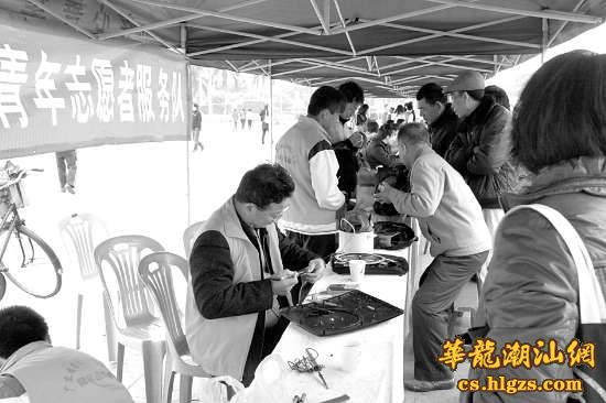 本报讯(记者 林彦恂 曾春乐 摄影报道) “前来维修家电的市民太多,只能采取‘排队叫号’的方式了!”昨天上午,市人民广场的义务维修家电摊位前围满了市民,而现场志愿者正一丝不苟地低头维修家电,忙得不亦乐乎。由市文明办、金平区委宣传部、市存心义工协会联合举办的“学雷锋、讲文明、树新风、我行动”志愿服务活动3日启动以来,取得良好的社会效应。昨天上午,市委常委、宣传部部长周镇松到市人民广场了解志愿服务开展情况。