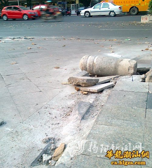 笔者来到现场看到,该路段同仁堂药店北侧门口有一个隔离墩躺在地上(见图。黄海燕 摄),交叉路口地面的石砖也破碎不堪,坑坑洼洼,一些石块还散落在路中间,而青年文化广场东侧的人行道上,几处下水道井盖周围的石砖也已出现破损,有车辆经过可听到井盖松动发出的响声。