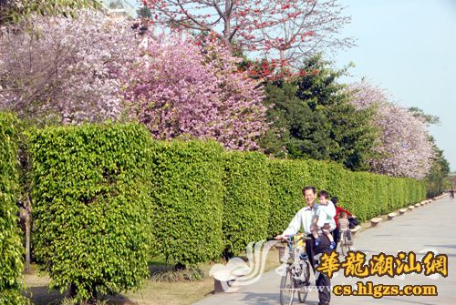 情景:市区沿江长廊,繁花满树,一派春意盎然,市民行走其间满是幸福表情。