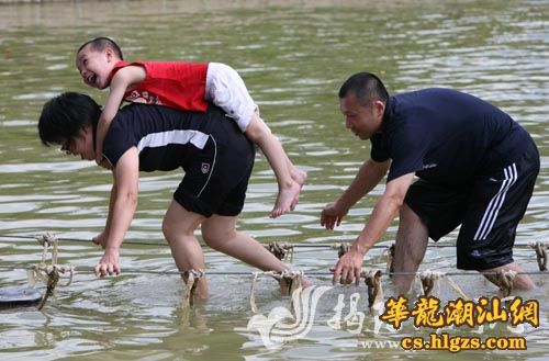 情景:一家三口在玩过河游戏,儿子爬在妈妈的背上放声大笑,爸爸跟在后面亦步亦趋担当“断后”和“掩护”的重任。