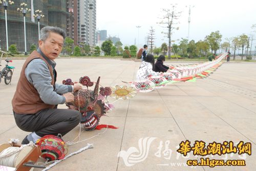 人物速写:黄建平,家住榕城区玉浦村的古稀老人,花2个月时间亲手制成45米长的龙型风筝并成功放飞。