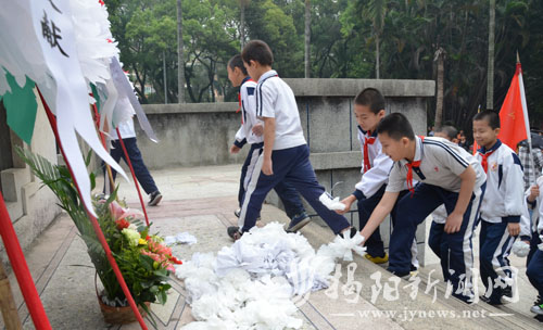 学生们献上亲手制作的小白花,表达对革命烈士的敬意和哀思。林一帆 摄