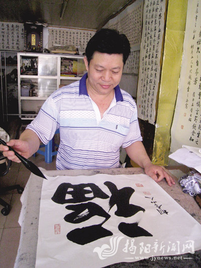 如今,大儿子27岁了,会赚钱了,林贤恺也减轻了负担。他们回到揭阳,林贤恺租了间小铺,专门供自己创作书画、教学生、会友。这几年,有了这间小铺,林贤恺练字更加专心致志,有时一坐就是一整天。他说:“练习书法关键是要心静,这是一件修心养性的美事,能陶冶人的性情。心情平静舒畅,心境和谐,写的字画的画就会有匀称的结构和优美的意境。”