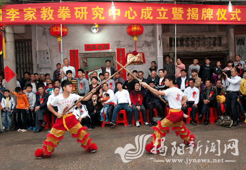 为传承、发扬光大传统中华武术,促进全民健身运动的开展,经批准,揭西县棉湖镇李家教拳研究中心于近日成立,有关部门及兄弟协会等共200多来宾参加了成立仪式。据了解,广东南拳李家教传人李铁牛大师,系梅州市五华县水寨人,相传其祖曾经商于江浙一带,与一少林寺方丈相交甚厚,随习得此拳。李氏一家为弘扬传播此拳,在清末期间,来到潮汕平原一带授艺,故称为李家教。图为研究中心的传统武术表演。