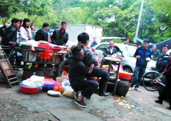 本报讯 (记者 林子海 林鹏 摄影报道)前日下午4时许,在春杏路段上演了一出“醉拳”打斗闹剧:一名醉酒男子和一名街边小贩互相打斗,结果引发众多市民围观与劝架,该路段过往交通为此受阻近半小时。