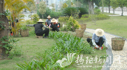 我市把创建广东省园林城市作为城市扩容提质、优化人居环境的民生工程来抓,目前成功跻身省园林城市行列。为进一步巩固成果,让创园成果惠及千家万户,市有关部门强化城市绿化的精细化管理,科学规范安排管护项目。图为趁春季,园艺工人对临江北路绿化带进行整形修剪、除杂草等养护工作。郑楚藩 摄